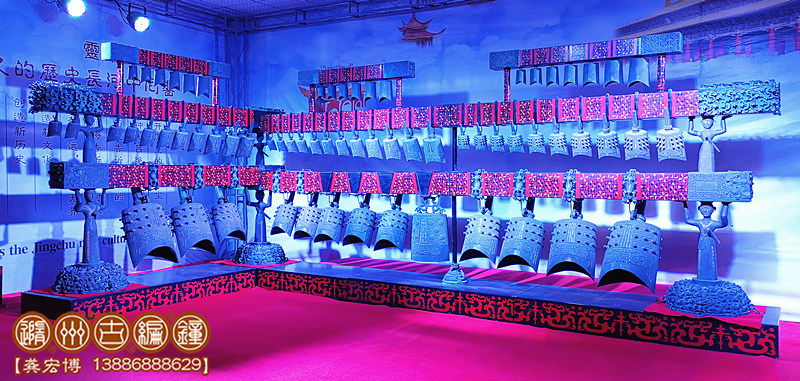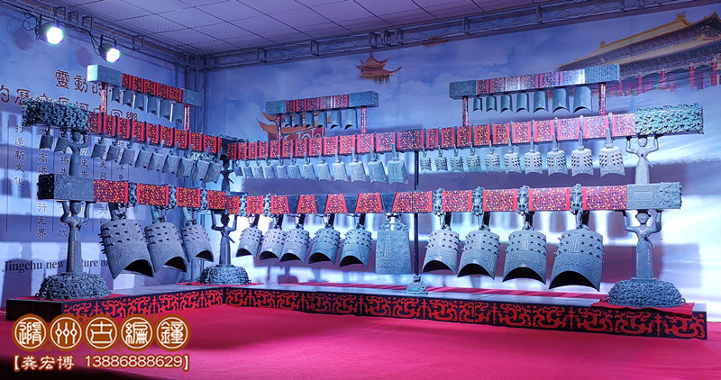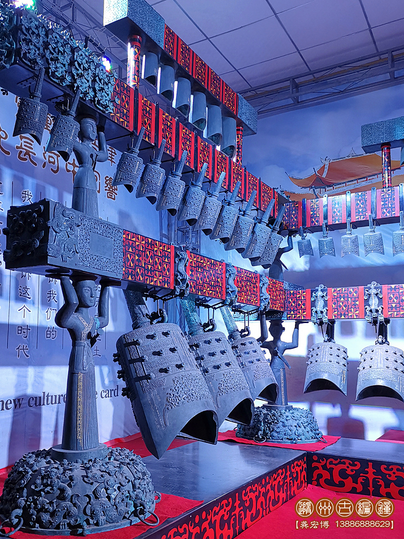 技術(shù)標(biāo)準(zhǔn):鑄件要求紋飾清晰,表面光潔,無(wú)裂、刺、孔、糙等鑄造缺陷;整套編鐘音域5個(gè)八度,一鐘雙音,按國(guó)際標(biāo)準(zhǔn)A=440Hz調(diào)音,音準(zhǔn)控制在±5Hz內(nèi),音色統(tǒng)一協(xié)調(diào),無(wú)雜、啞音響。其中下層13件為倍低音甬鐘,在演奏中起到烘托氣氛的作用,中層33件為中音域甬鐘,十二半音齊備,主要用于演奏主旋律,上層19件為被高音鐘和補(bǔ)音鐘,也是重要的半音和補(bǔ)充被高音音域,3組設(shè)計(jì)可以用于演奏復(fù)試旋律。其結(jié)構(gòu)、配件、銘文等全部按照曾侯乙編鐘樣式仿制。