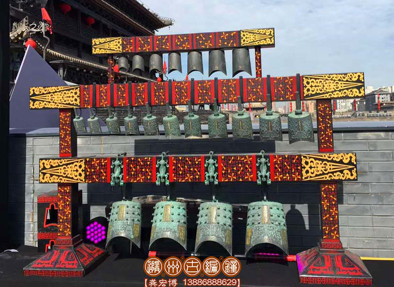 22件古編鐘分3層懸掛,中心音律齊備,下層配套4件低音甬鐘在演奏中起烘托作用,因樣式古典,常用于小學音樂教育,國學表演以及漢式婚禮演奏使用,木架結構設計,安裝十分方便。