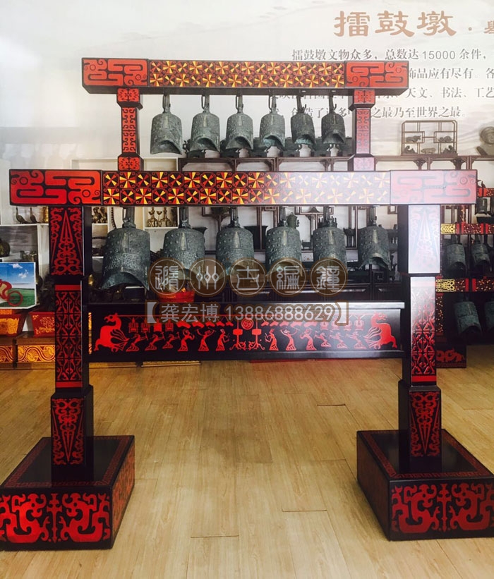 12件演奏型編鐘支架采用漆木工藝制作,古樸典雅,鐘音優(yōu)美準(zhǔn)確。