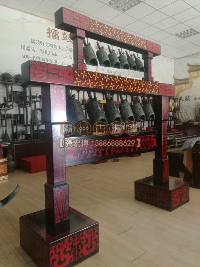 上??蛻舳ㄖ频?2件編鐘長2米、高2米、寬0.55米,分兩層懸掛了12件青銅編鐘,每件編鐘均可發(fā)出2個不同的樂音,半音齊備,采用A=440Hz標(biāo)準(zhǔn)調(diào)音,適合小型民樂團(tuán)體使用,豐富了民樂團(tuán)的整體音樂效果,從而獲得客戶的一致好評。
